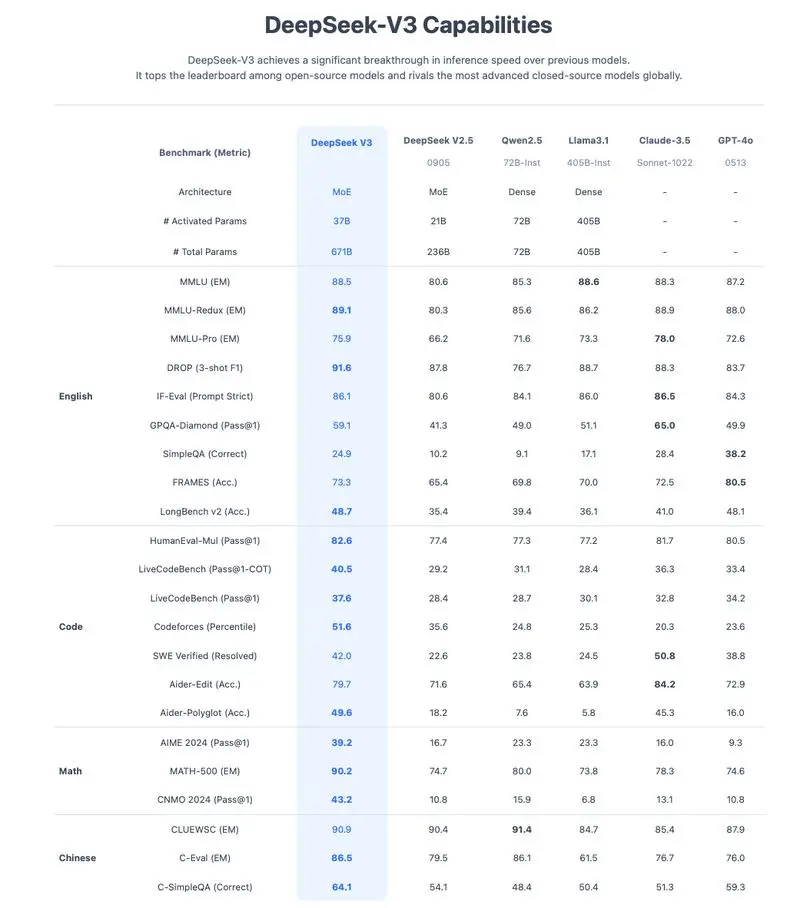 Overall, the table suggests that DeepSeek V3 is no longer just an “open-source contender”—it competes closely with other major players, at times outperforming them in specific categories.