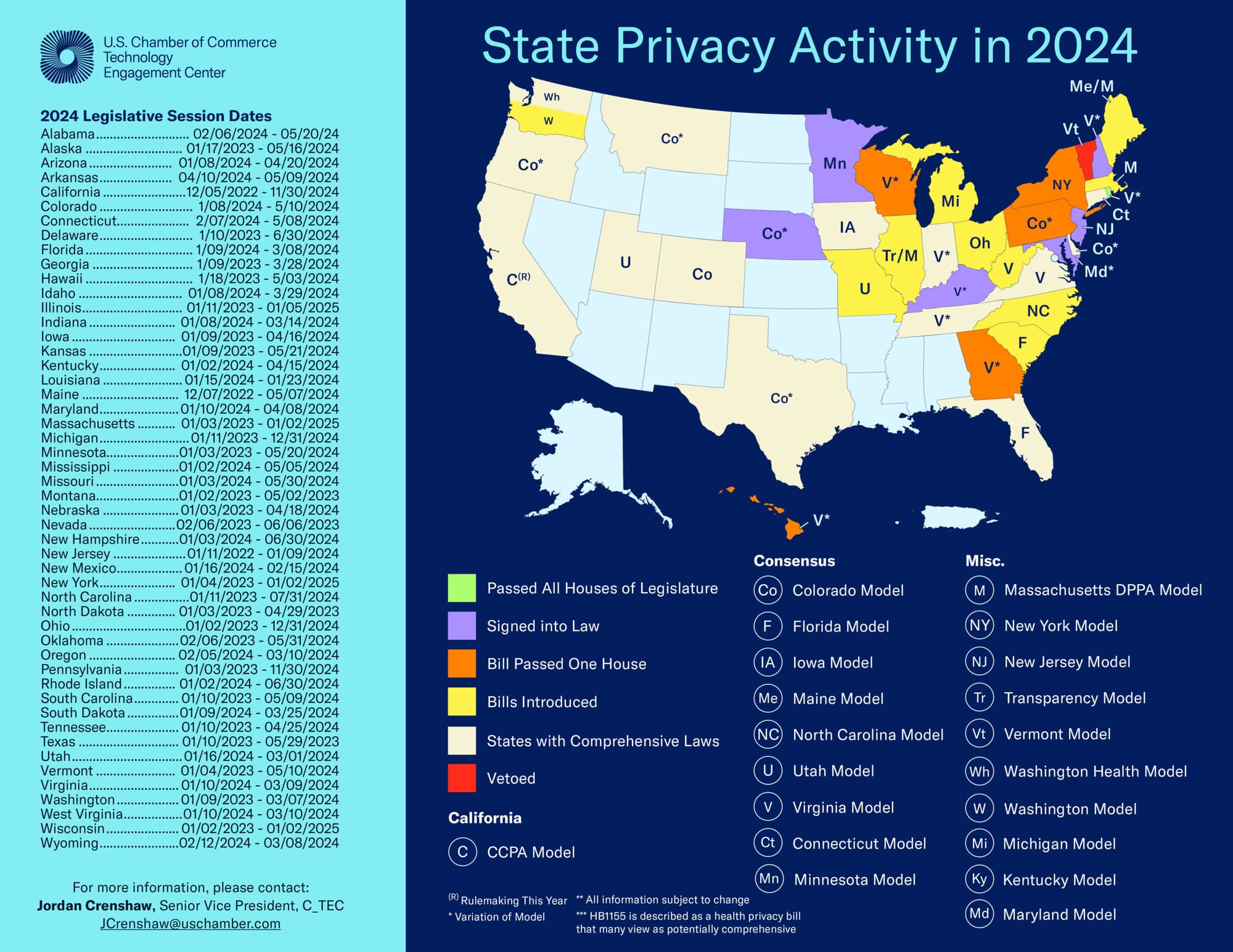 - Current Status: North Carolina has proposed the North Carolina Consumer Privacy Act (SB 525), which is currently under review by the Senate Committee on Rules and Operations. The bill’s fate remains uncertain, but it reflects a strong push towards comprehensive privacy regulation.- Key Provisions:Applicability: Targets businesses with annual revenue of $25 million or more, processing personal data of 100,000 or more consumers, or deriving over 50% of revenue from data sales.- Consumer Rights: Includes rights to access, delete, and obtain copies of personal data, and to opt out of data processing for targeted advertising and sales.- Enforcement: Grants the Attorney General exclusive enforcement authority and does not provide a private right of action. Impact on Businesses: If enacted, businesses will need to implement robust data security practices and provide clear privacy notices. The focus on larger businesses means smaller entities may not be directly affected, but those in compliance will need to align with the law’s requirements.