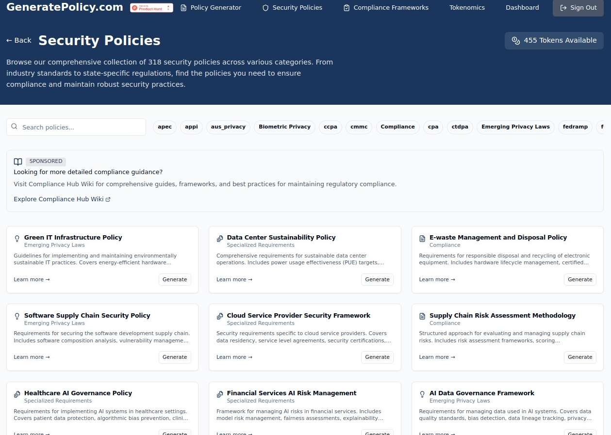 - AI-Powered Policy Generation: At its core, GeneratePolicy.com utilizes AI algorithms to create policies that are not only comprehensive but also aligned with industry best practices and standards.- Support for Major Compliance Frameworks: The platform supports a wide range of major cybersecurity and compliance frameworks, including NIST, ISO 27001, CIS, OWASP, MITRE ATT&CK, GDPR, HIPAA, and PCI DSS. This ensures that the policies you generate are relevant to your specific compliance obligations.- Easy Customization: While the AI provides a strong foundation, policies are easily customizable to match your organizationโs specific operational needs and risk profile.- Continuous Updates: Staying compliant requires policies to be up-to-date with evolving regulations and industry shifts. GeneratePolicy.com offers continuous updates to policies, ensuring your documentation remains current.- User-Friendly Dashboard: Managing your policies is simple with the user-friendly dashboard, allowing you to easily access, update, and download your documents.- Token-Based Pricing: The token-based pricing model offers a scalable and flexible approach. You purchase tokens and use them to create or update policies as needed, making it an affordable solution for companies of all sizes.- Compliance Ready: Policies generated by the platform are designed to support and align with various regulatory requirements like GDPR, HIPAA, and PCI DSS.- Time and Cost Savings: GeneratePolicy.com significantly reduces the time and cost associated with cybersecurity policy creation. What used to take weeks can now be accomplished in minutes.- Enhanced Security Posture: By providing professional-grade documentation, GeneratePolicy.com helps enhance your organizationโs overall cybersecurity posture.- Seamless Integration: The platform offers a simple web-based interface, and policies can be downloaded in multiple formats (PDF, Word) for easy integration into your existing documentation workflows and compliance dashboards.- Rapid Onboarding: Getting started with GeneratePolicy.com is quick and easy, providing immediate value with minimal onboarding time.