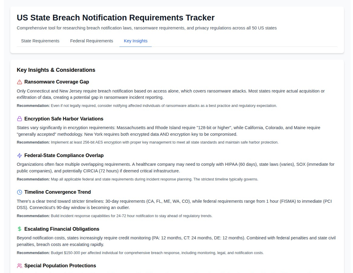 The US State Breach Notification Requirements Tracker represents a valuable resource for organizations seeking to maintain comprehensive compliance with the complex landscape of breach notification laws. By providing centralized access to detailed requirements across all US jurisdictions, along with federal obligations and actionable insights, the tool addresses critical gaps in current compliance approaches.