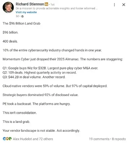 Let me make that concrete. In 2025, 400 cybersecurity companies changed ownership. That means 400 companies whose products you may have evaluated, purchased, deployed, integrated, and built security workflows around are now controlled by different entities with different priorities, different product roadmaps, and different commitments to the features you depend on.