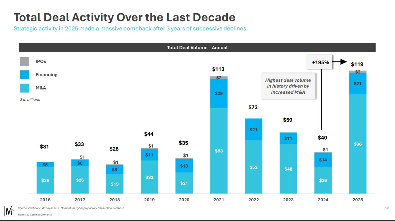 In January 2026, Momentum Cyber released its sixth annual Cybersecurity Almanac. The headline numbers read like a trophy case for investment bankers: $96 billion deployed across 400 transactions. A 294% year-over-year increase in deal value. The largest pure-play cybersecurity acquisition in history — Google swallowing Wiz for $32 billion. Q2 saw the highest quarterly transaction count ever recorded. Q3 broke the quarterly deal value record at $44.2 billion.