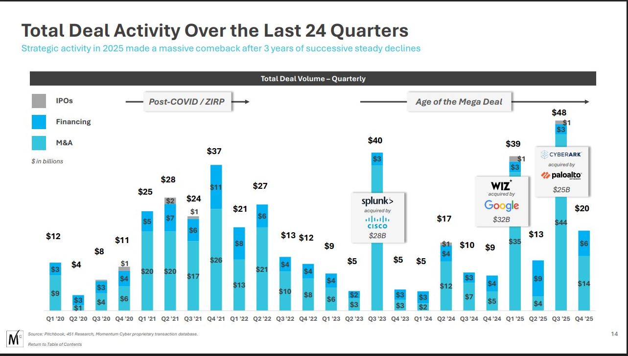 The Momentum Cyber Almanac is a valuable document. It quantifies what’s happening. But what it doesn’t do — what no investment banking report ever does — is ask who this benefits beyond the parties to the transaction.