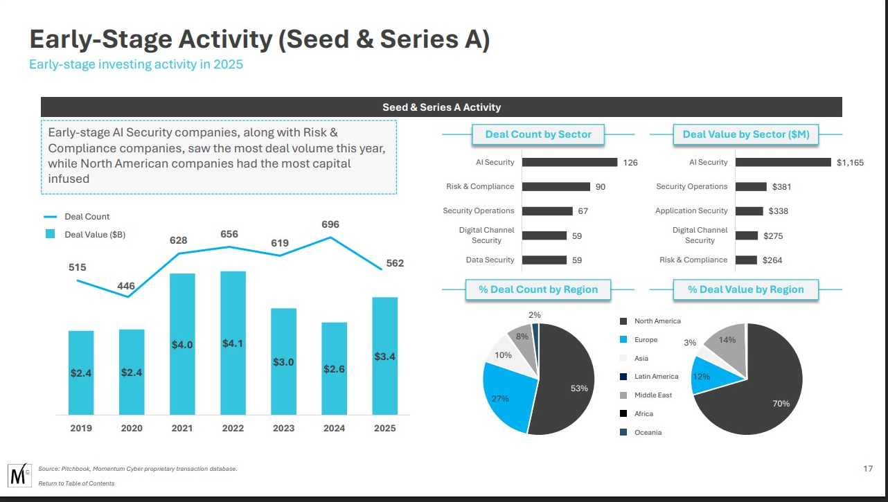 Momentum Cyber’s own data tells the platformization story plainly. The most active M&A sectors were Security Services (126 deals) and Risk & Compliance (63 deals). These aren’t exotic technology categories. These are the operational backbone of how organizations actually get secured — the assessments, the consulting, the managed services, the compliance work. The platforms are not just buying technology. They’re buying the service layer and industrializing it.