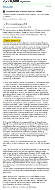 Over 2.76 million people signed a petition demanding the government not introduce digital ID cards. On October 2, 2025, the government responded by stating: “We will introduce a digital ID within this Parliament to help tackle illegal migration, make accessing government services easier, and enable wider efficiencies.”