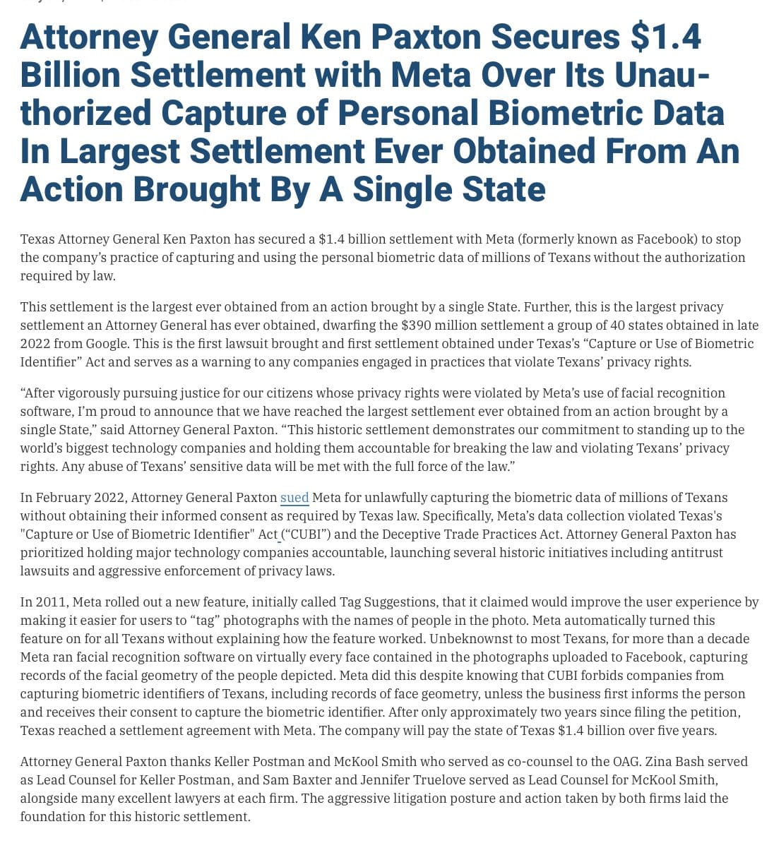 Ken Paxton Secures $1.4 Billion Settlement with Meta Over Biometric Data Violations